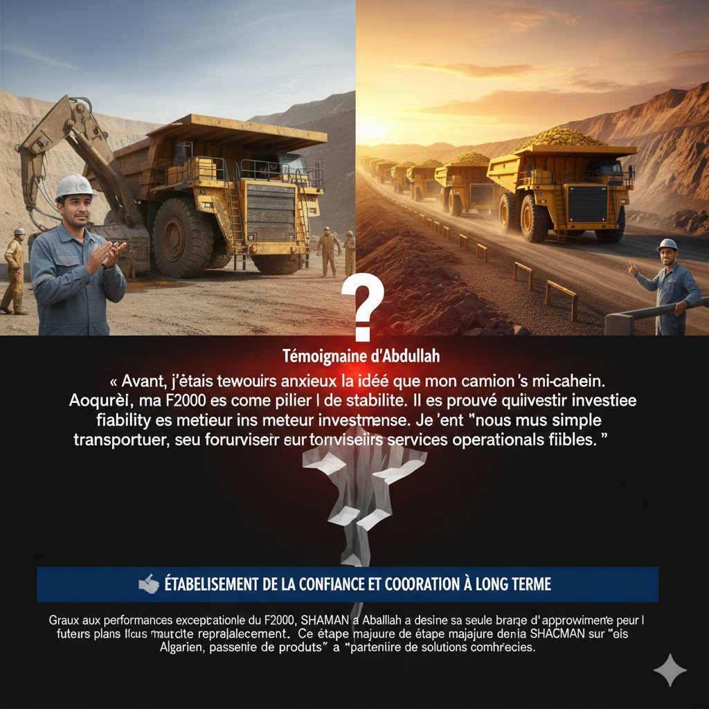 Grâce aux performances exceptionnelles du F2000, Abdullah a désigné SHACMAN comme sa seule marque d’approvisionnement pour les futurs plans de remplacement. Ce n’est pas seulement un succès commercial, c’est une étape majeure dans la transformation de SHACMAN sur le marché algérien, passant de “fournisseur de produits” à “partenaire de solutions commerciales”.